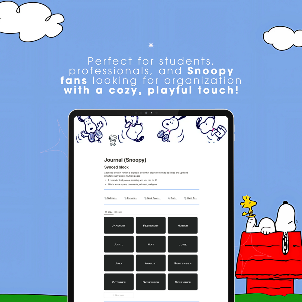 Step into the world of Snoopy and the Peanuts gang with this delightful Notion template! Designed to keep you organized, motivated, and inspired, this template combines functionality with the heartwarming charm of everyone’s favorite beagle. Perfect for fans of Snoopy and creative planners alike, this template makes every task feel a little more joyful.