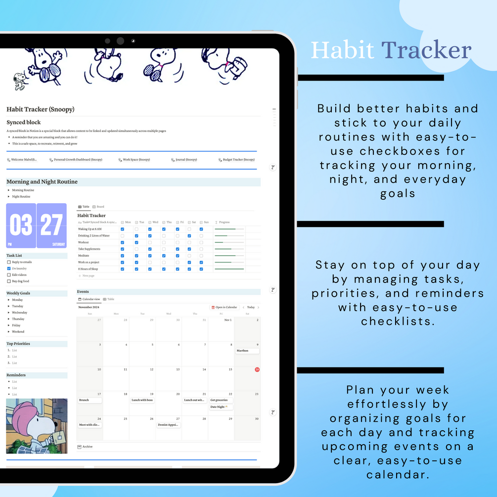 Bring the charm of Snoopy into your daily routine and make every moment a little brighter! Let this playful and practical template guide you through all your tasks and goals with Snoopy’s signature style and spirit.