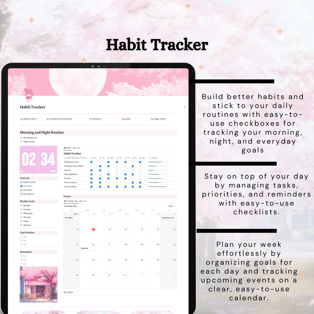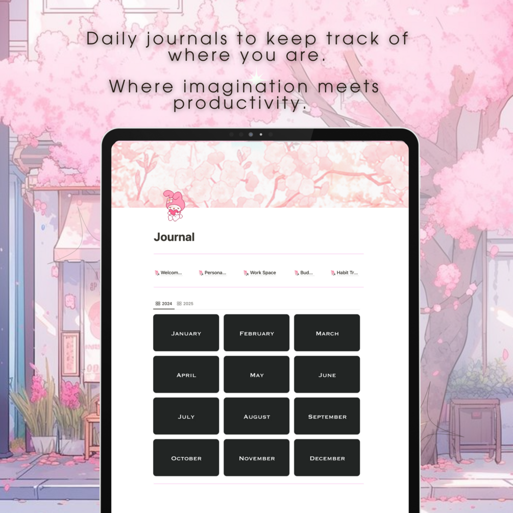 Whether you're staying organized, tracking habits, managing budgets, or journaling your thoughts, this template adds a touch of grace and tranquility to your daily life. Let the charm of cherry blossoms bloom in every task and project, making planning both productive and delightful.