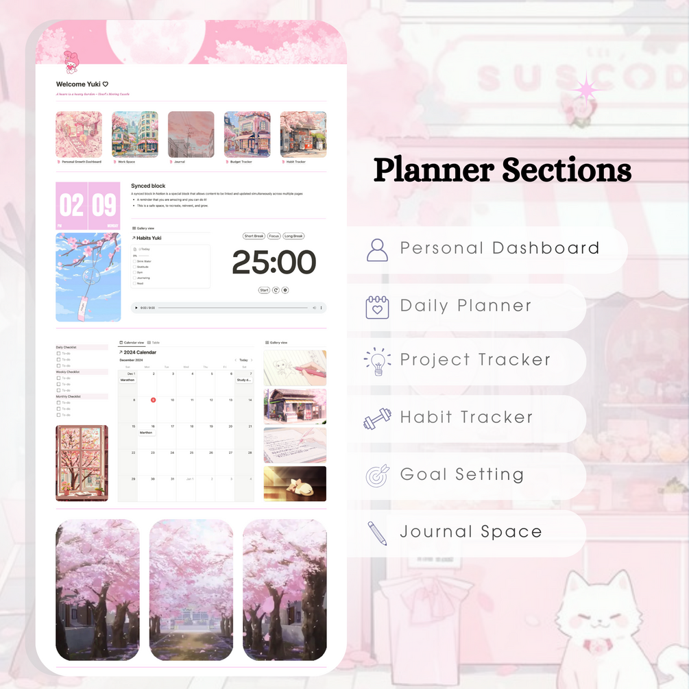 Whether you're staying organized, tracking habits, managing budgets, or journaling your thoughts, this template adds a touch of grace and tranquility to your daily life. Let the charm of cherry blossoms bloom in every task and project, making planning both productive and delightful.