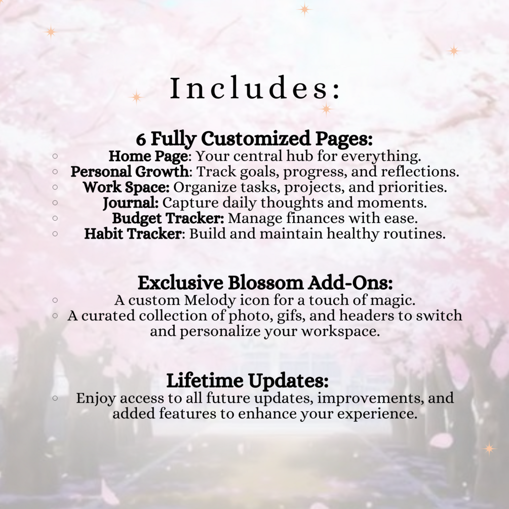 ✧ INCLUDED IN YOUR PURCHASE ✧ ✮ PDF with a link to the template you can duplicate and customize. ✮ Custom cherry blossom-inspired headers and illustrations for a serene look and feel. ✮ Detailed setup instructions to help you get started and personalize the template. ✮ Lifetime access to the template, including all future updates!