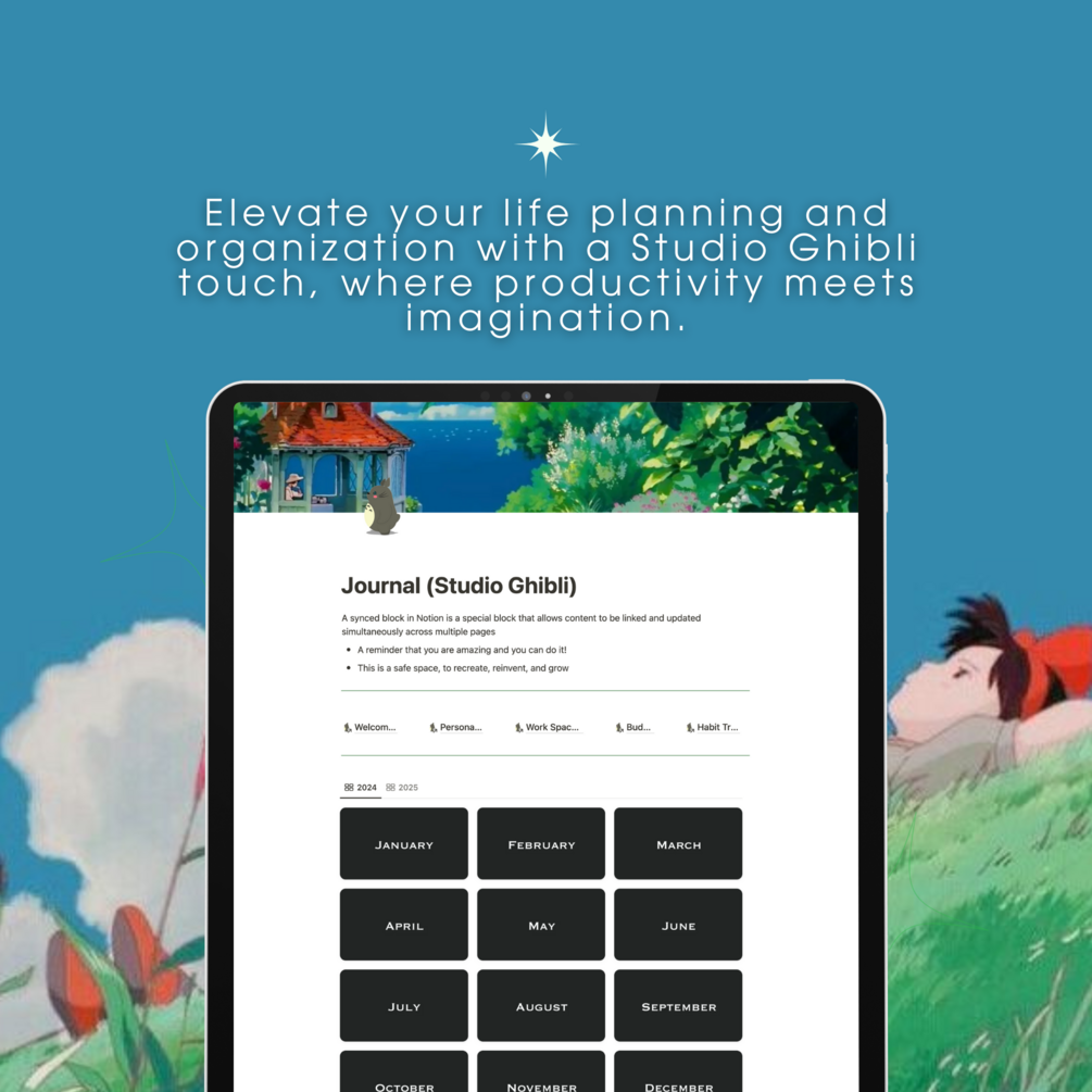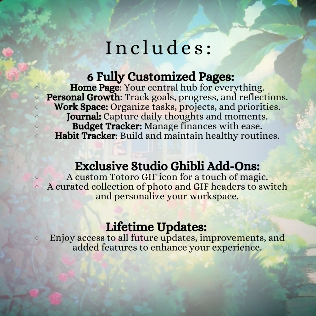 Bring the enchanting world of Studio Ghibli into your daily life with this Ghibli-themed Notion template. Perfect for organizing tasks, tracking habits, managing budgets, and planning your goals—all in a beautifully designed, aesthetic workspace inspired by your favorite films.